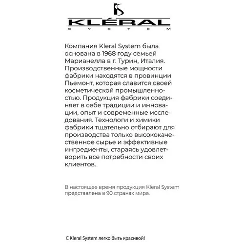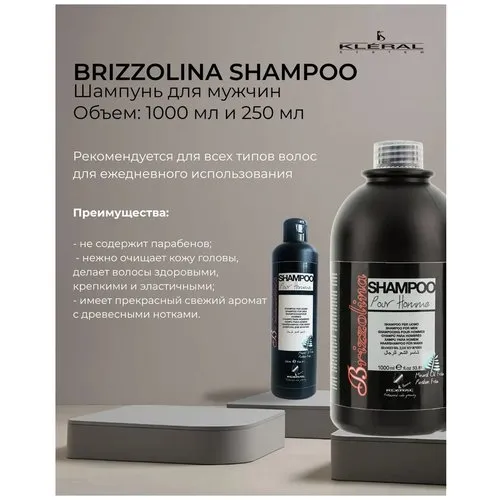 Ментоловое масло: нормализует работу сальных желез, мягко очищает поры кожи, успокаивает зуд и раздражение, улучшает рост волос, стимулирует кровоо- бращение, укрепляет корни, придает волосам блеск. Экстракт арктического папоротника:обладает очищающим и заживляющим свой- ствами. Масло ягод пальмового дерева асаи: укрепляет и питает волосы, обеспечивает увлажнение волос, защищает от неблагоприятного воздействия ультрафиолето- вых лучей. Лимонную кислоту: обладает стягивающими свойствами, нормализует pH- баланс кожи головы. Пропиленгликоль: увлажняет волосы, действует как антистатик. Kleral Шампунь мужской BRIZZOLINA Shampoo Рекомендуется для всех типов волос для ежедневного применения. Преимущества: - не содержит парабены - нежно очищает кожу головы, делает волосы здоровыми, крепкими и эластичными - обладает прекрасным свежим ароматом с древесными нотками