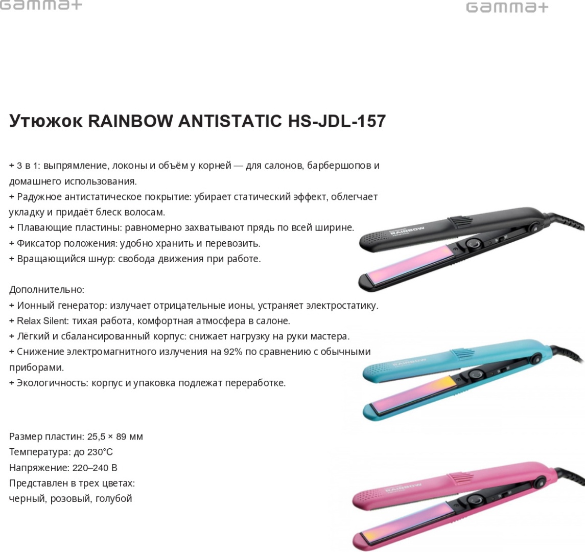 HAIRSTRAIGHTENER RAINBOW ANTISTATIC SKY-BLUE 140°÷230° \ Выпрямитель для волос серии “GAMMA+ STRAIGHTENER” модель JDL-157